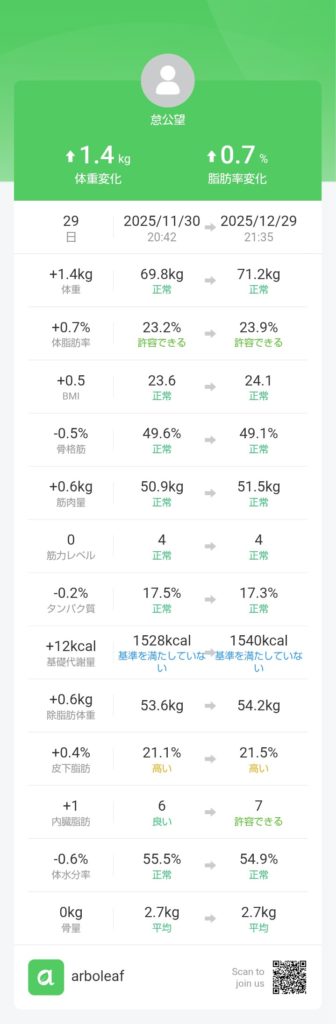もうちょっと筋トレを継続していけば、その差が表れてくるはずなので、ただ太っただけなのか、筋肉が増えたのかは来月あたりに判断できそうですね。